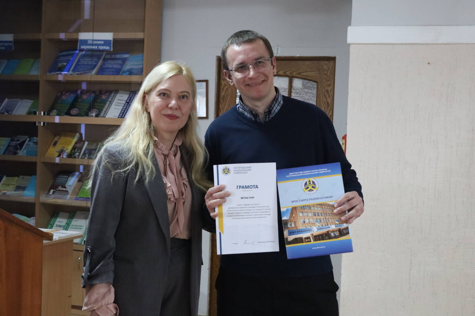 Віталій Штефуца, начальник відділу з питань запобігання та виявлення корупції Ужгородської міської ради, згадав своє навчання на кафедрі під наставництвом Володимира Боднара та Василя Ходанича та вручив грамоти від міського голови.