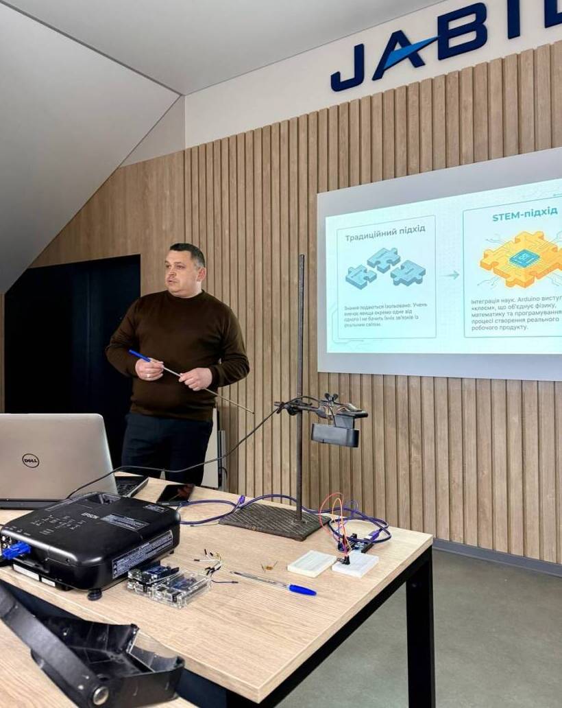 На фізичному факультеті викладач кафедри оптики Василь Біганич влаштував майстер-клас для румунських та українських колег на тему «Проєкт Arduino в контексті STEM-освіти». Тренер розповів, як трансформувати кабінет фізики від пасивного спостереження до інженерного мейкерства. На конкретному прикладі було реалізовано алгоритм STEM-уроку: від формулювання завдання через вибір інструмента (датчика), складання схеми, програмування – до аналізу даних.