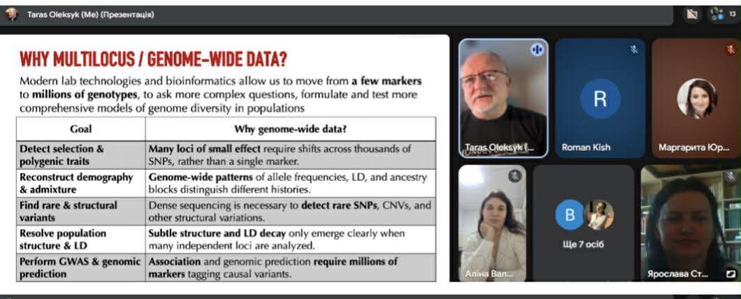 У межах циклу занять студенти розглядають сучасне бачення геноміки як науки, що працює не з окремим геном, а з усією системою одночасно. Якщо класична генетика дивилася на окремий «ген-кандидат», то геноміка аналізує мільйони варіантів по всьому геному й намагається зрозуміти, як вони разом формують риси, хвороби й адаптації.