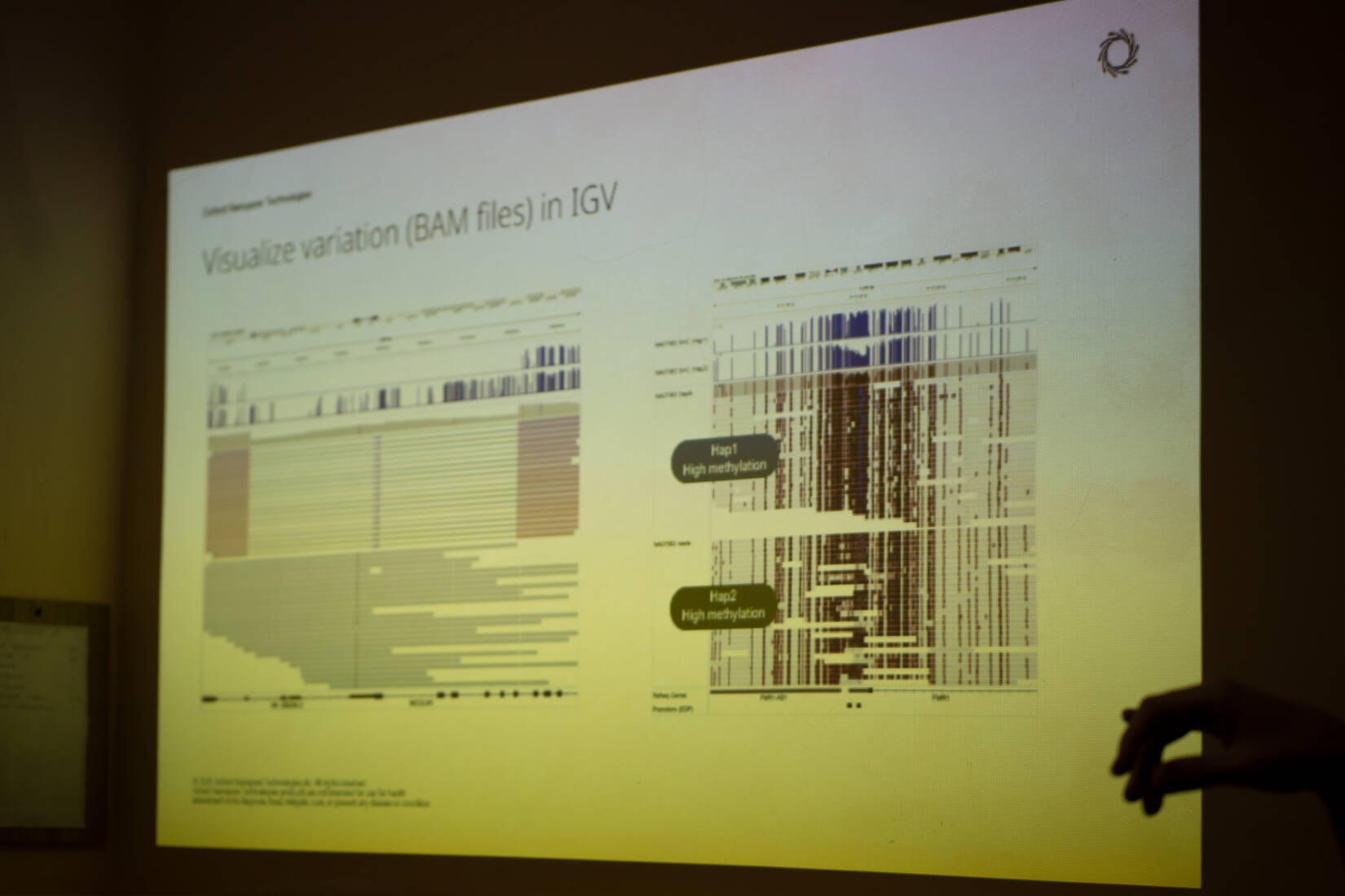 Технологія Oxford Nanopore Technologies (ONT) виконує секвенування, пропускаючи нитки ДНК через нанопору – надзвичайно малий отвір у тонкій мембрані. Під час проходження молекули через пору відбуваються зміни електричного струму, які реєструються в режимі реального часу. Алгоритми перетворюють ці коливання електричного сигналу на послідовність нуклеотидів, тобто у рядки ДНК (ріди). Метод секвенування за допомогою ONT вирізняється високою швидкістю, простотою підготовки зразків і відносно низькою вартістю. Крім того, процес можна проводити на компактних приладах, які поміщаються на долоні. А що при цьому немає потреби фрагментувати ДНК, отримані ріди можуть бути надзвичайно довгими – від сотень тисяч нуклеотидів до цілих хромосом. Завдяки цьому зникає потреба в складній комп’ютерній реконструкції послідовностей із коротких фрагментів, як це відбувається при традиційних методах. Для багатьох складних ділянок геному достатньо просто виконати секвенування, щоб одразу мати безперервну карту хромосоми. Технологія ONT є значним кроком уперед у розвитку геномних досліджень. Вона відкриває нові можливості як для фундаментальної геноміки (збірки геномів де-ново), так і для клінічної діагностики (виявлення генетичних варіацій і спадкових хвороб), а також для екологічних досліджень (ідентифікації видів у змішаних біологічних зразках).