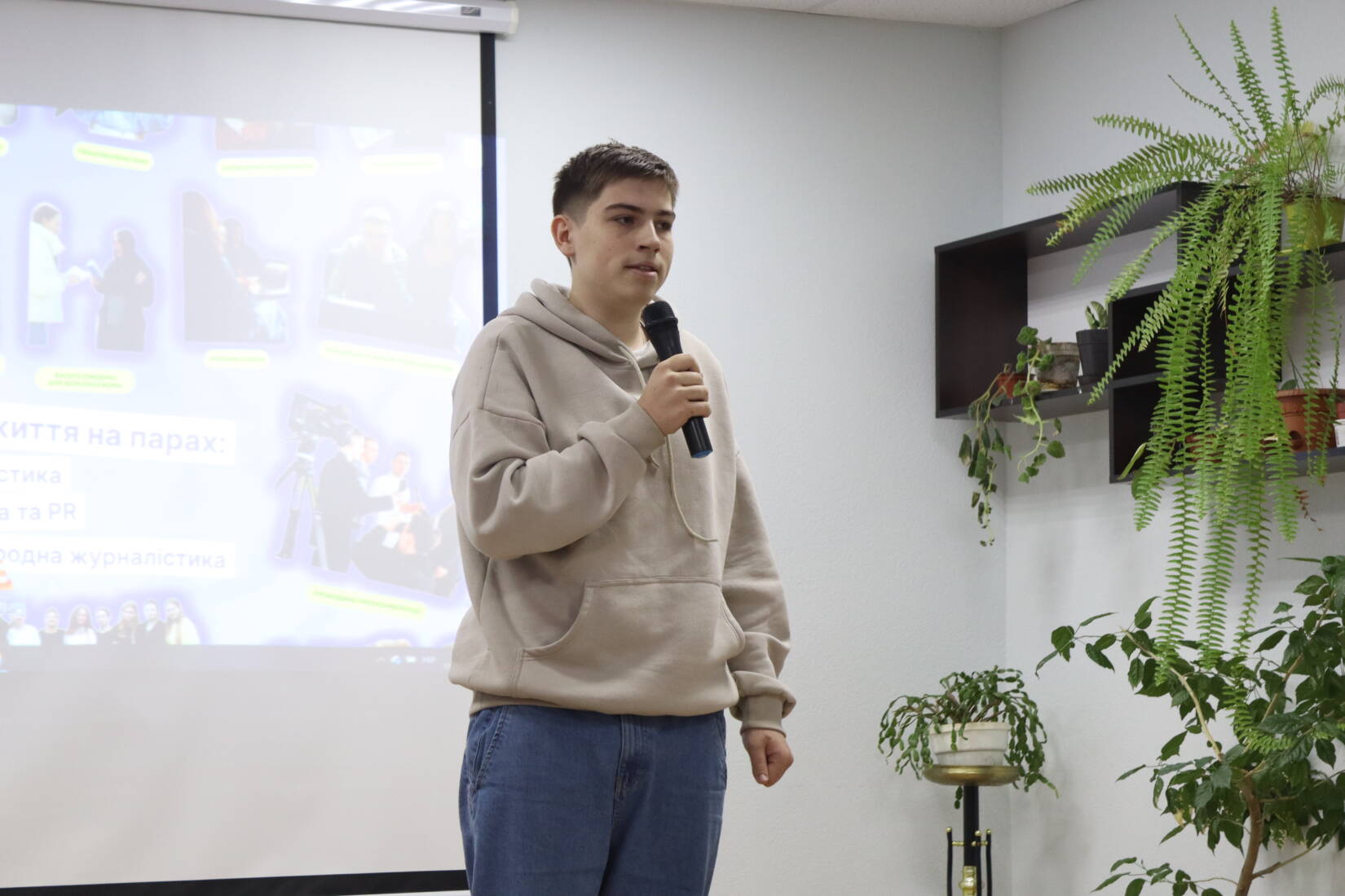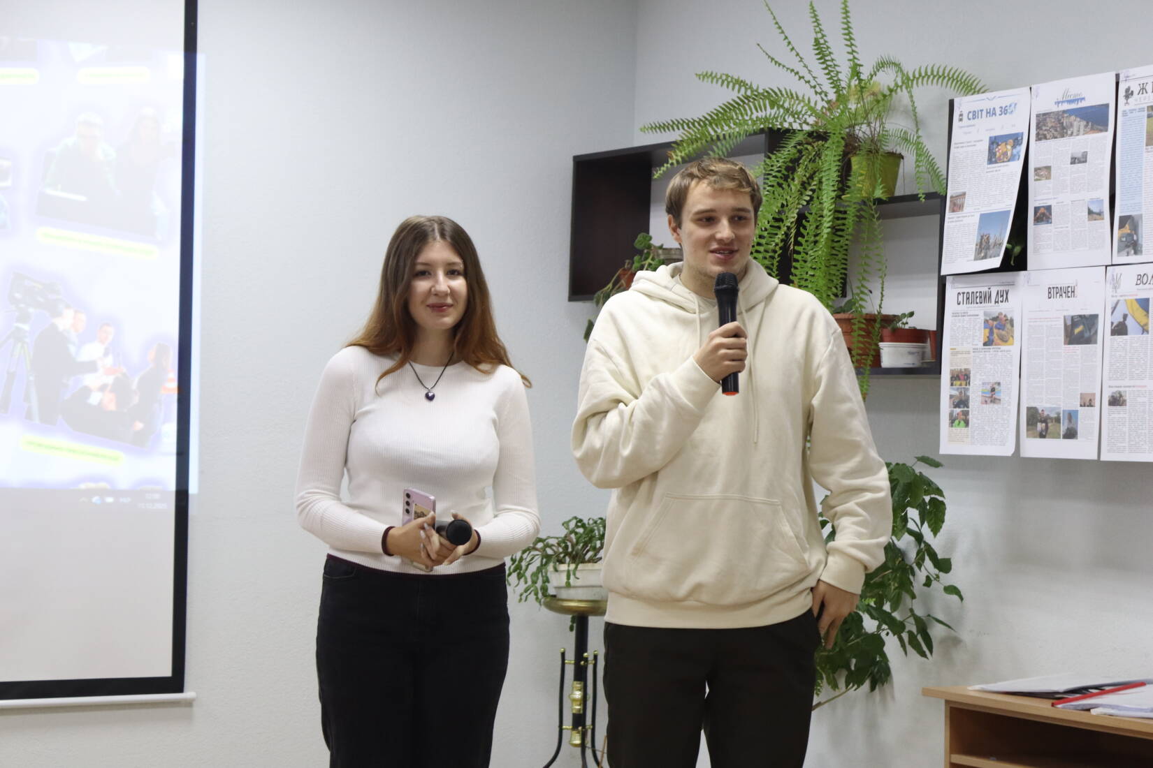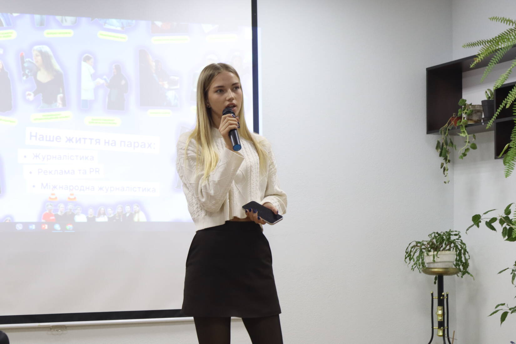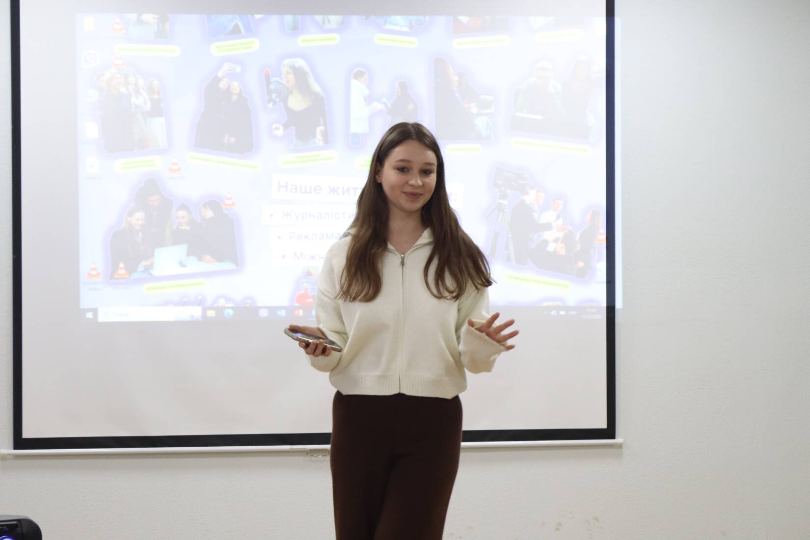 Розпочали презентацію першокурсники Ольга Заєць і Данііл Соломін, які поділилися враженнями групи від початку навчання. За семестр вони створили власну газету, записали радіопакет, опублікували п’ять, а дехто й більше, матеріалів у медіа, самостійно сформували вебпортфоліо й виконали вправу «Слово» — імпровізований виступ у прямому ефірі.