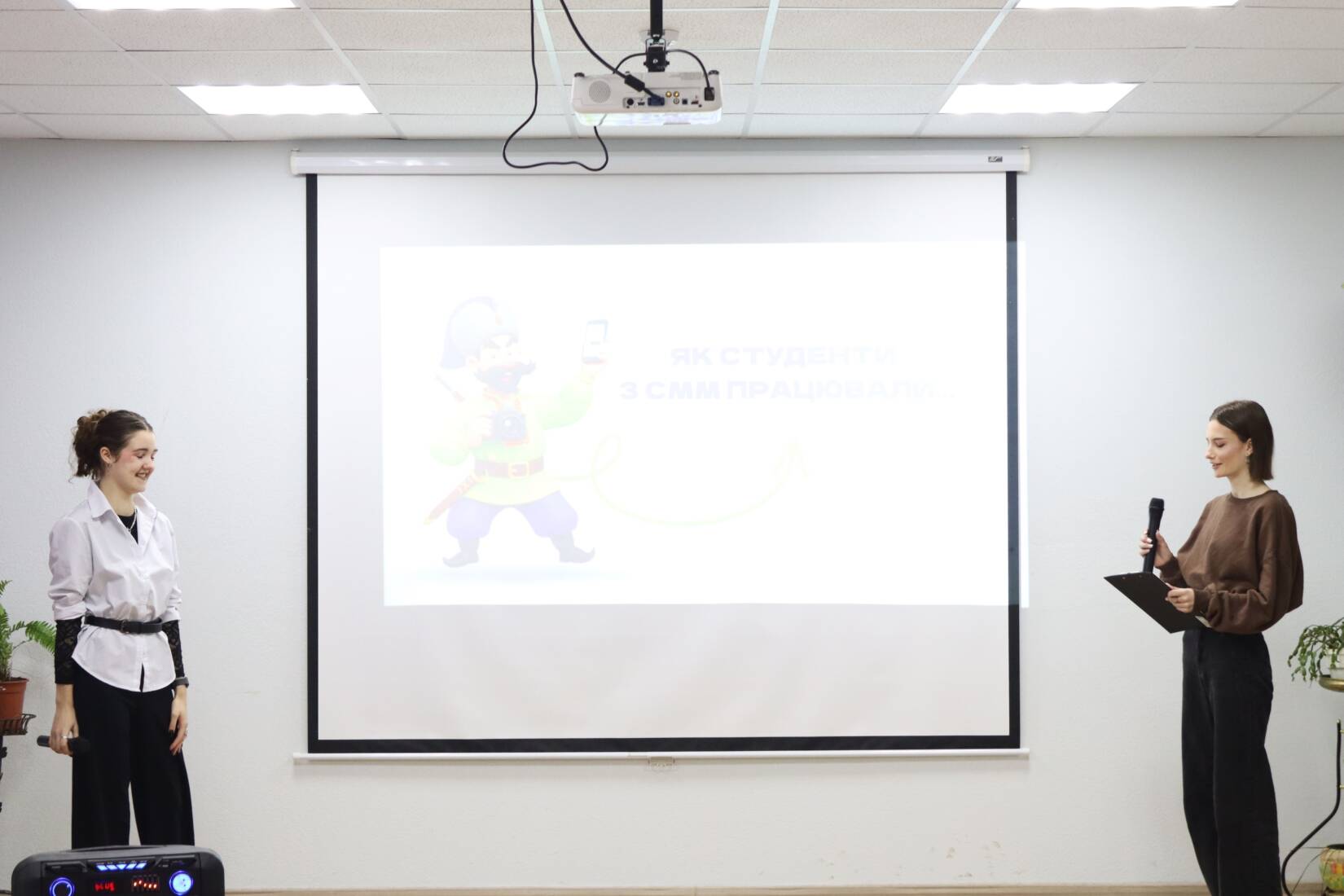 Крістіна Крицька та Анастасія Савко презентували роботу в царині SMM. Студенти всіх курсів активно працювали з соціальними мережами кафедри: створювали інфографіки, дописи й відеоконтент, експериментували з візуальними й текстовими хуками. Як наслідок, за чотири місяці Instagram-акаунт кафедри набрав понад 190 тисяч переглядів.