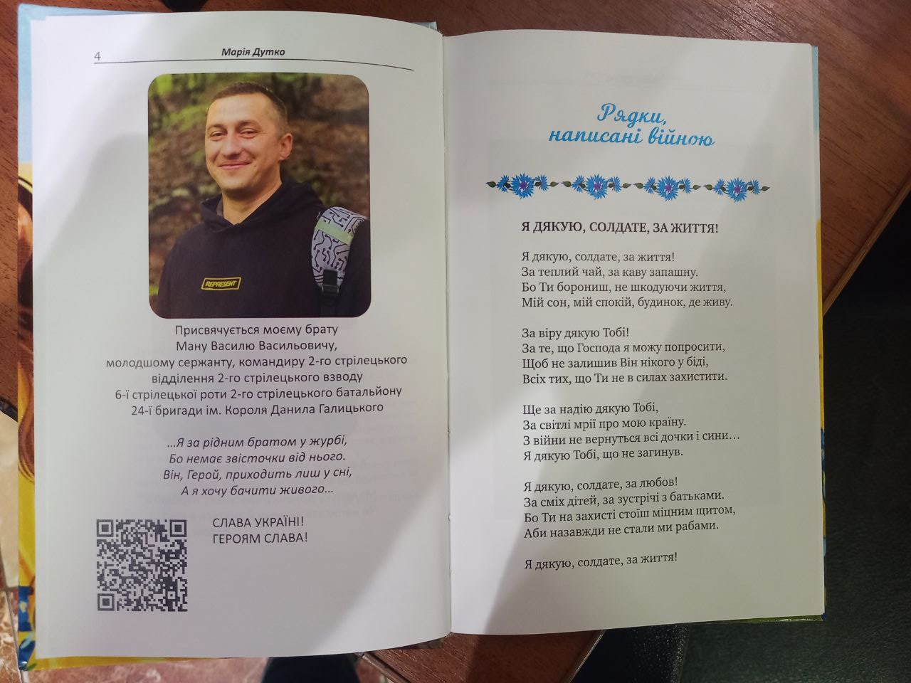 Книга «Я дякую, солдате, за життя!» побачила світ цьогоріч за сприяння БО БФ «Фонд Фреда в Україні». Видання складається з 4 розділів («Рядки, написані війною», «Рідний край», «Стан душі» та «Поетичний календар») і вміщує більше 100 поезій на різну тематику. Ілюстроване фотографіями чоловіка авторки Василя Дутка та світлинами з мережі.