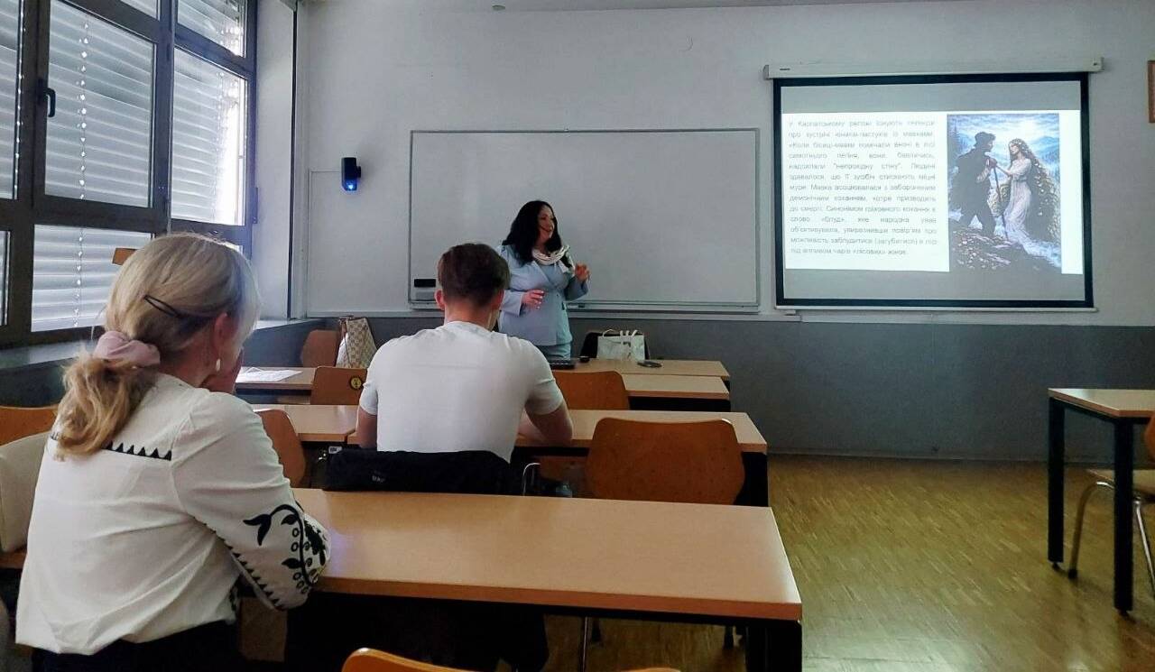 Лекції професорки Оксани Тиховської були присвячені українській міфології. Зокрема, вона розповіла студентам про образи мавки, русалки, чугайстра та перелесника, простежила їх переосмислення у творах українських письменників. Здобувачі освіти виявили зацікавленість темою, обмінювалися власними думками стосовно міфологічних образів, проводили типологічні паралелі до європейської міфології та літератури, ділилися вподобаннями у царині українського фентезі. Також студентам цікаво було дізнатися про образи слов’янських богів, їх об’єктивацію в українських казках, легендах, обрядах та фентезійній прозі. Ще дві лекції були присвячені космогонічним міфам українців про створення світу птахами та ритуал ініціації і його моделі в сучасній українській прозі.