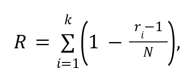 де N — загальна кількість команд, k ‒ кількість команд від університету, ri ‒ місце першої команди університету в рейтингу.