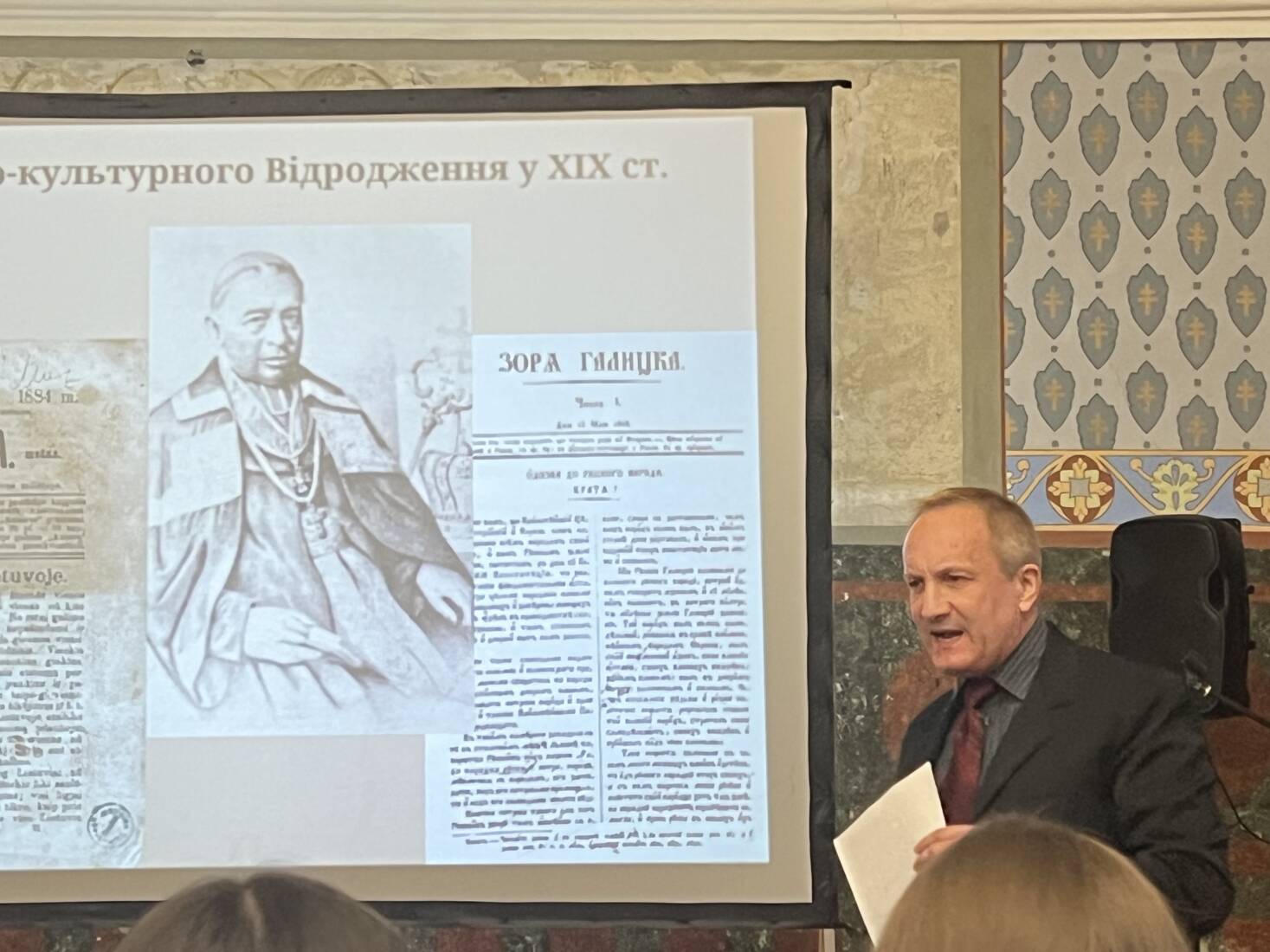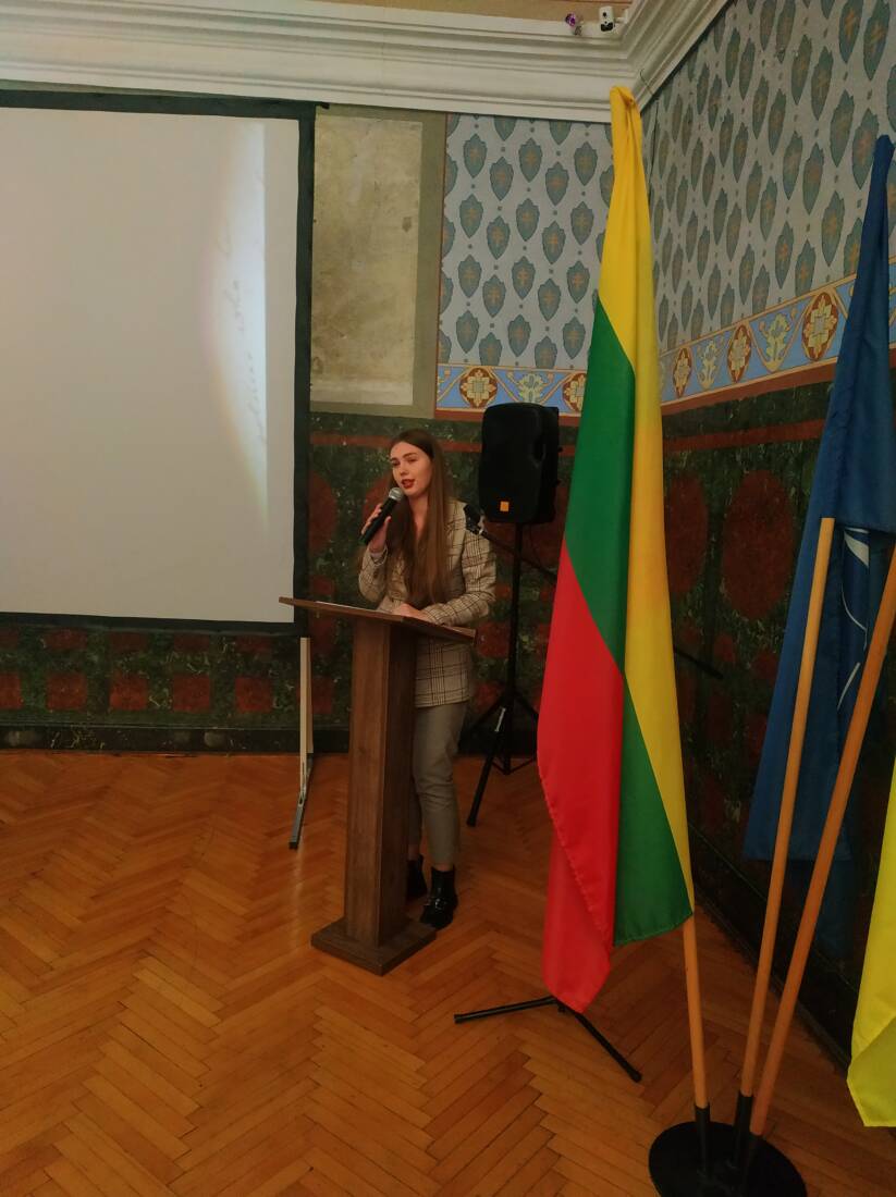 Далі увазі присутніх була представлена доповідь-презентація «Що ми знаємо і що маємо знати про Мікалоюса К. Чюрльоніса», котру виголосили старший викладач кафедри модерної історії України та зарубіжних країн Сергій Ганус та магістрантка цієї ж кафедри, голова СНТ «КЛІО» Іванна Бабинець. Дівчина вже працює за фахом в обласному краєзнавчому музеї і зарекомендувала себе в науковому житті університету. Доповідь була вибудувана на порівняльній характеристиці процесів національно-культурного Відродження українців та литовців, з котрим такі імені, як Крістіонас Донелайтіс (1714-1789) та Іван Котляревський (1769-1838), Йонас Басанавічус (1861-1927) та митрополит Григорій Яхимович (1792-1863), Тарас Шевченко (1814-1861) та Мікалоюс К. Чюрльоніс (1875-1911) найтіснішим чином пов’язані та уособлюють це культурно-історичне явище як таке. А що стосується головного героя події, то Чюрльоніс, подібно Шевченку, створив унікальний сплав багатогранного потенціалу своєї обдарованої натури, у рівній мірі зробивши внесок у музику та живопис, фольклористику та літературу. Творчість Чюрльоніса – це живопис у музиці та музика в живописі з моделюванням образності лише йому властивими засобами. Врешті найяскравіші постаті обох народів осмислили те, що ми б назвали філософією національної ідеї.