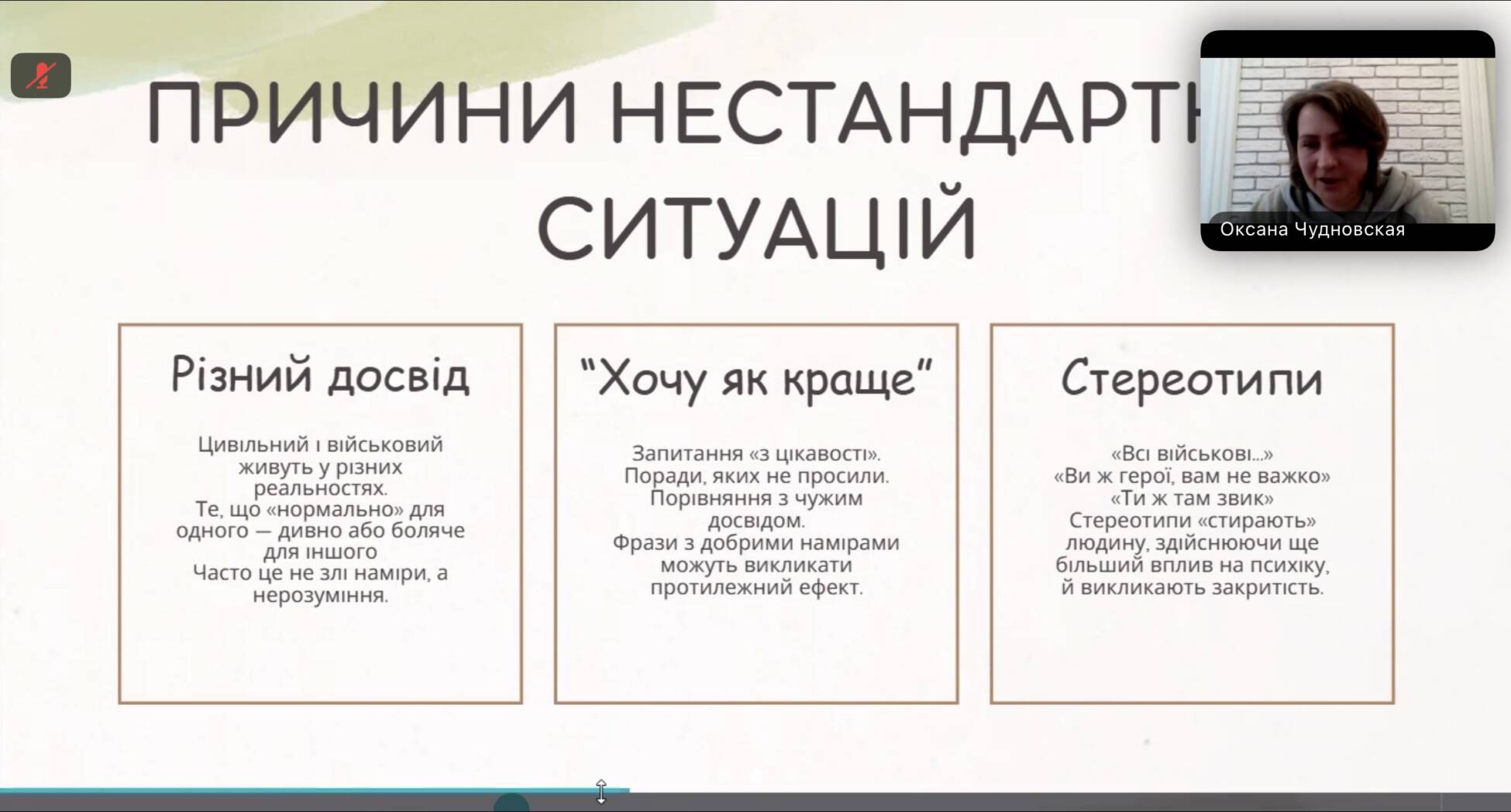 Студентка 4-го курсу Дарʼя Максимова розповіла після тренінгу: «Безсумнівно, це актуальна тема для нашого часу. Мій батько теж брав участь у бойових діях. У кожного з нас є родичі чи знайомі, які захищали нашу країну. Було цікаво почути з уст фахівчині, як вона спілкується з ветеранами і як діяла б у тій чи тій ситуації».